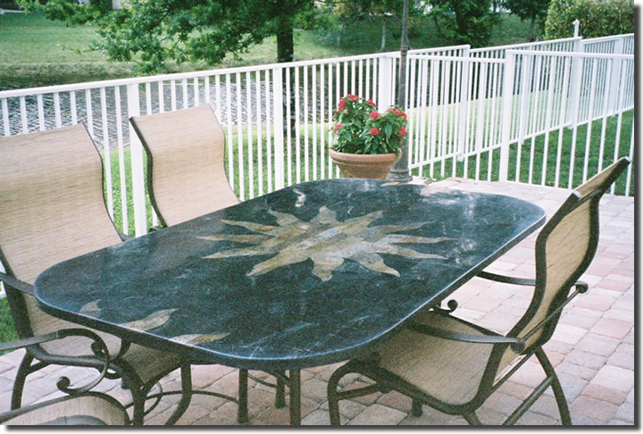 (Atelier oval tops are shaped to give up to 10% more surface area in the same space taken up by a racetrack oval.) The Aztec Sun Table Top comes in 24" round, 30" round, 48" round, 25"x38" oval, 44"x74" oval, 44"x84" oval, and 38" x 108" oval sizes. Photos of all top sizes are available upon request. Click HERE to see the Aztec Sun Round Top. Other sizes are available by special order, contact us. All sizes of Atelier stone tops are a generous 1-1/4" thick. All tops are fully finished in smooth highly polished stone - no rough stones, rough edges, or grout lines. Bottoms are fully finished in smooth stone to 1-1/2" from edge - no rough surface to touch. Atelier tops fasten to any type of table base with standard stainless wood screws. (table bases shown are generic and not for sale) |