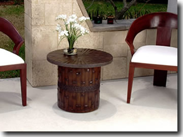 Accent / Side Table: 16" diameter base 24" x 1-1/4" round top 19" high overall. Top has abaca rope edge and a surface starburst pattern of split bamboo. Center accent of base is abaca.