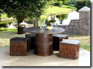 Dining Table: Base 23" diameter at top & bottom 20" diameter at center 48" x 1-1/4" round top 30" high overall Top has an abaca rope edge, surface is starburst pattern of split bamboo. Center accent of base is abaca.