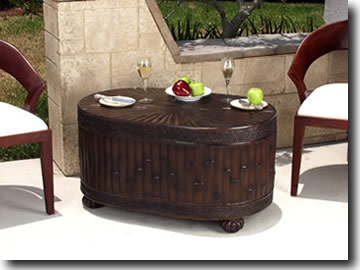 Coffee / Low Dining Table: Racetrack Oval, 24" wide, 38" long, 20" high Add your own larger safety glass to expand size. Top surface has starburst pattern of split bamboo. Accent bands are abaca. Carved bun feet have matching finish.