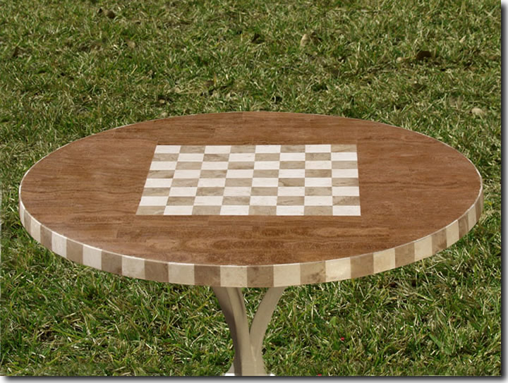 The GameBoard Table Top comes in 24" round, 30" round, 48" round, and 25"x38" oval sizes. Photos of all top sizes are available upon request. Other sizes are available by special order, contact us. All sizes of Atelier stone tops are a generous 1-1/4" thick. All tops are fully finished in smooth highly polished stone - no rough stones, rough edges, or grout lines. Bottoms are fully finished in smooth stone to 1-1/2" from edge - no rough surface to touch. Atelier tops fasten to any type of table base with standard stainless wood screws. (table bases shown are generic and not for sale) |