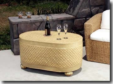 Coffee / Low Dining Table: Racetrack Oval, 24" wide, 38" long, 20" high Accent bands are raffia. Carved bun feet have matching finish. Add your own larger safety glass to expand size.